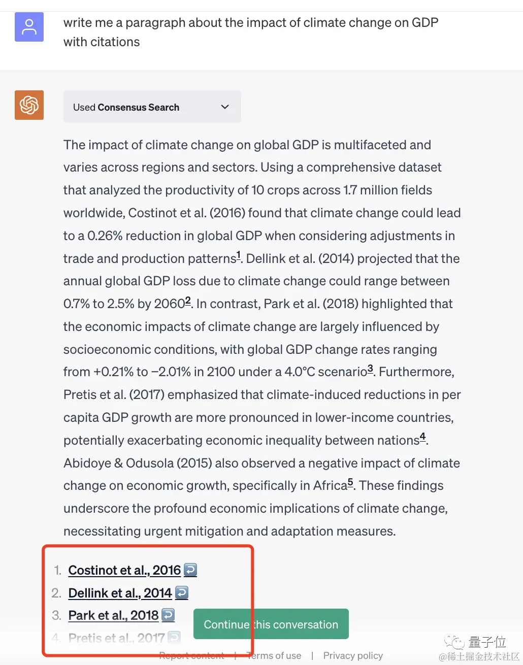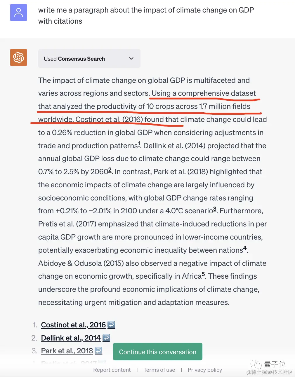 比如:“给我写一段关于气候变化对 GDP 影响的论述,并附上引文。”