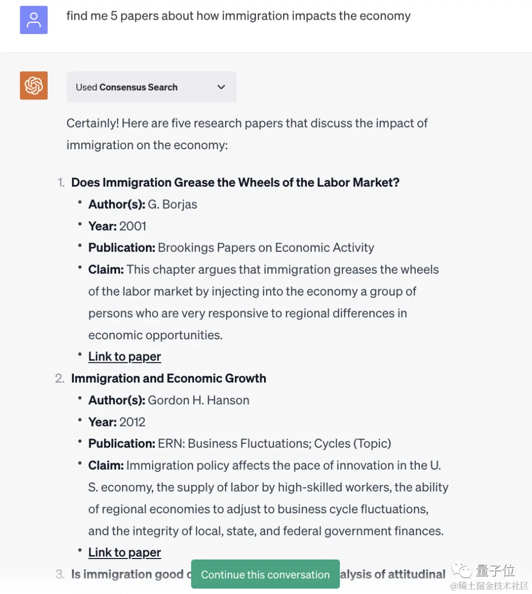 比如:“给我找 5 篇关于移民如何影响经济的论文”,插件给出的答案就是这样的: