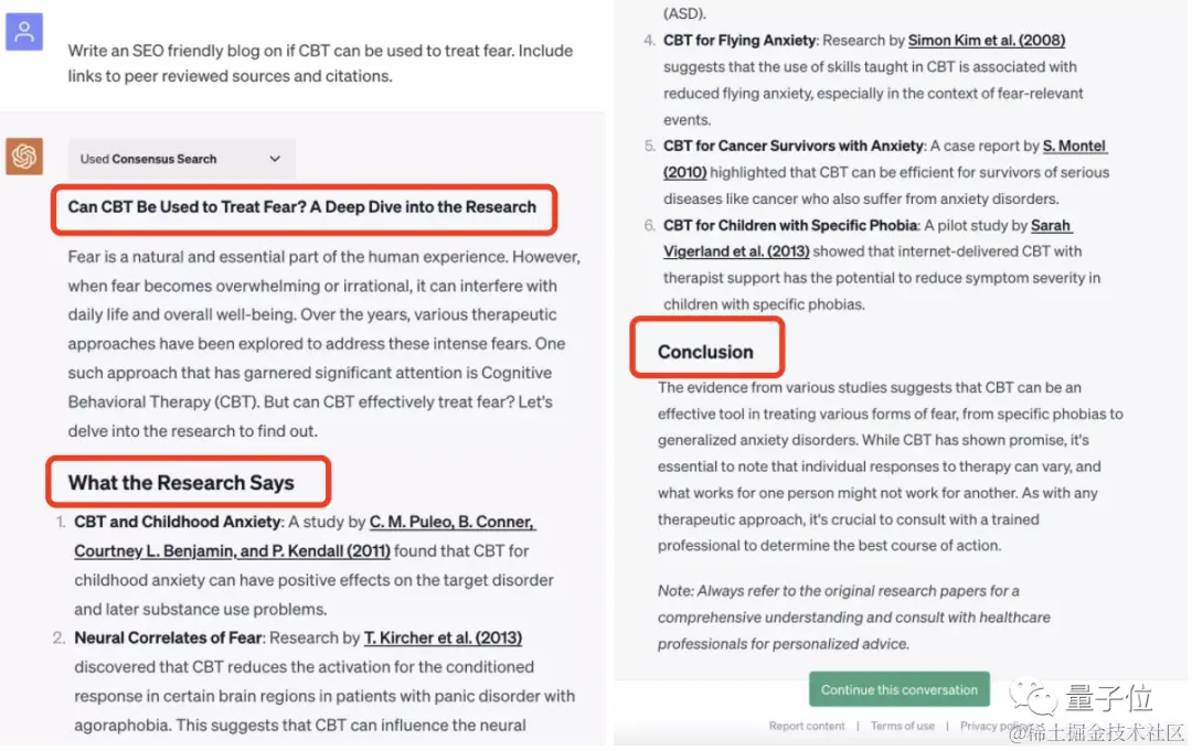 提示词如 “写一篇 SEO 友好的博客,讨论 CBT(认知行为疗法)是否可以治疗恐惧,包含经同行评审的论文链接”。