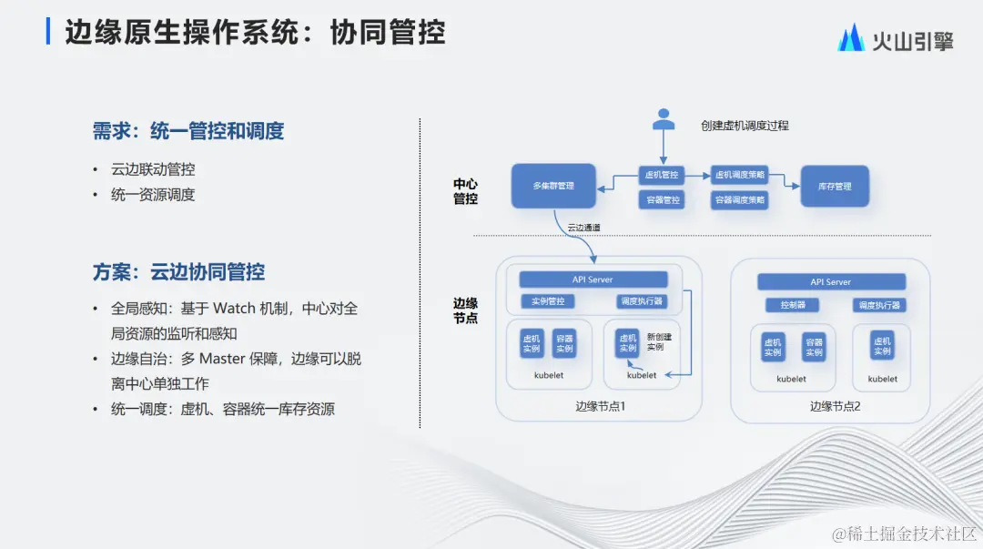 协同管控的需求是统一管控和调度,包括云边联动管控和统一资源调度。方案是自研的云边协同管控系统,包括三个关键点: