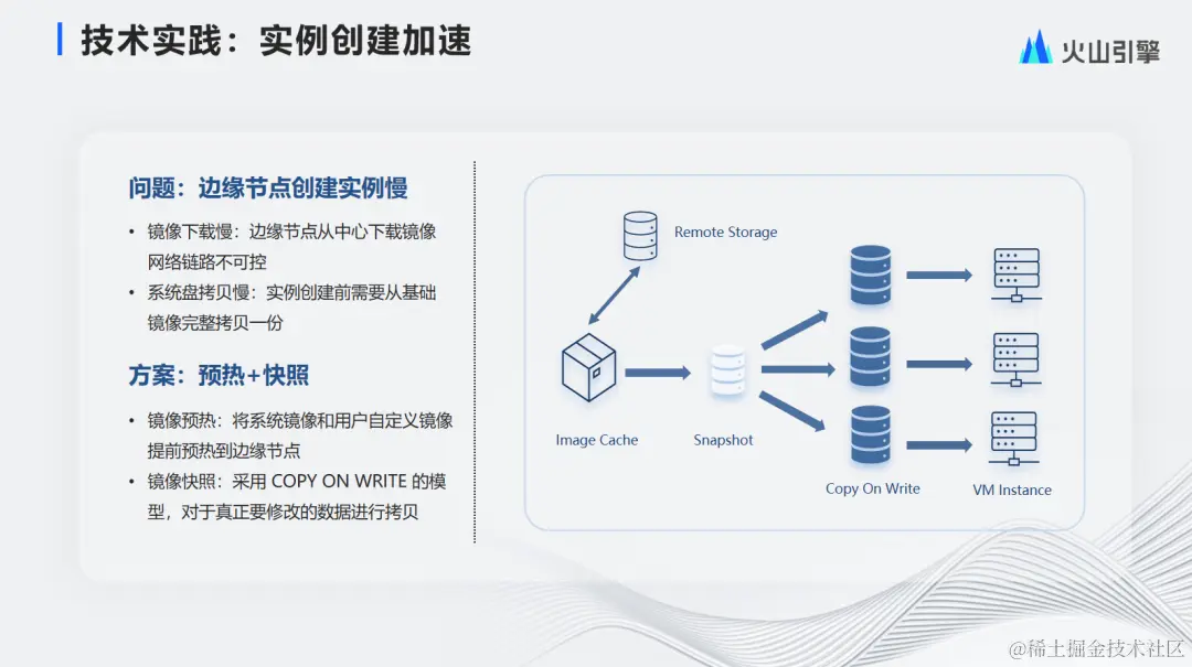 第一个是实例创建加速,其问题是边缘节点创建实例慢,包括两方面原因:一是镜像下载慢,由于边缘节点从中心下载镜像较慢,由于镜像下载需要走公网进行传输,因此镜像下载的时间是不可控的。二是实例创建需要从基础镜像完整拷贝一份,如果镜像较大,拷贝也会较耗时