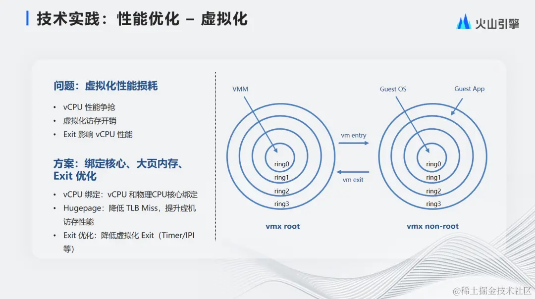 我们在性能优化层面进行了虚拟化性能优化。顾名思义,虚拟机是由软件虚拟而来,因此虚拟机在一定程度上存在性能损耗,体现在以下三点: