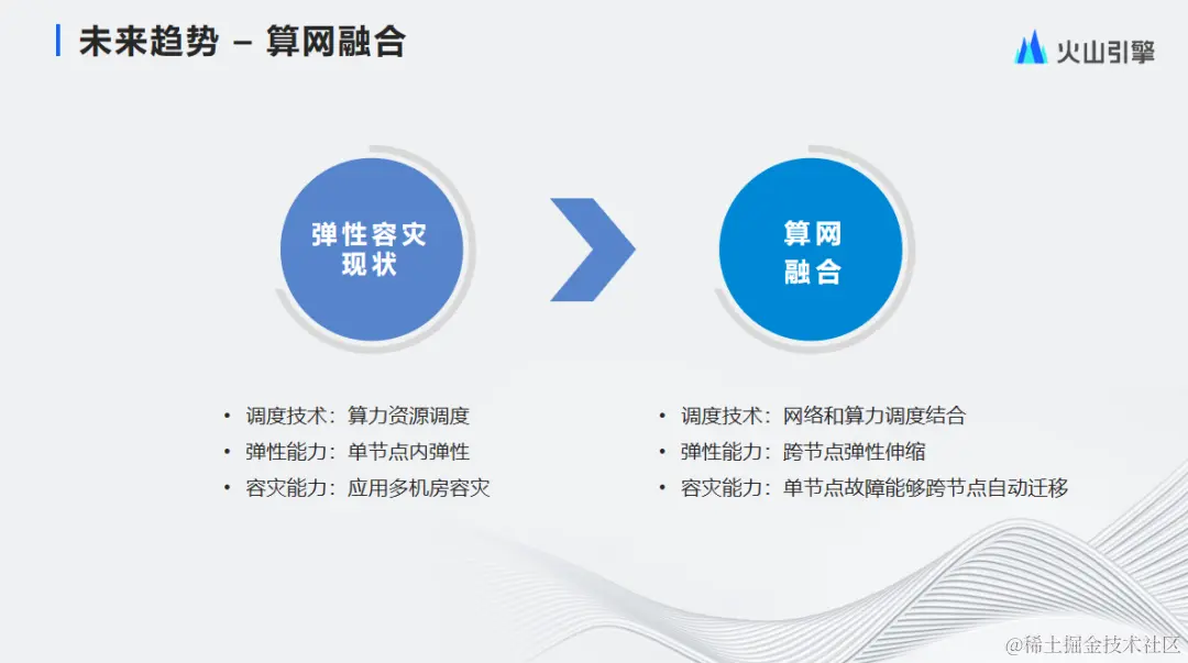 其次是算网的深度融合,当前我们更依赖于单个节点的弹性能力以及单个节点的算力资源调度。应用需要自己做多机房的容灾能力,未来我们会做算力网络深度融合,统一调度网络资源和CPU算力资源,实现跨节点的弹性伸缩能力,使得部分业务在不同节点间自由迁移,更好地利用不同节点的资源。