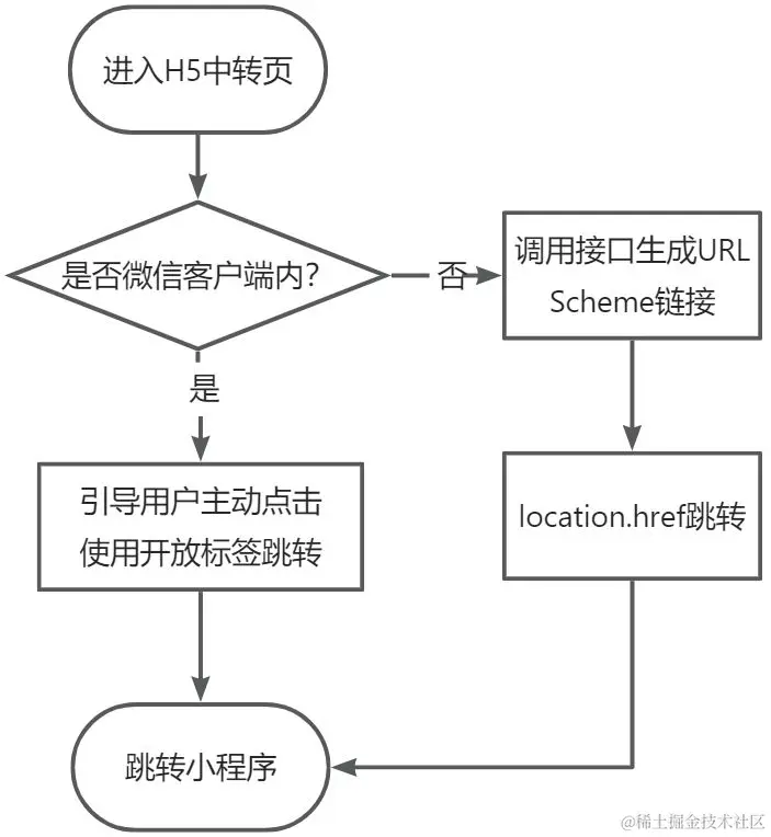 所以最好的方式是,建立一个H5中转页,检测是否为微信客户端内,如果是微信客户端,则使用免鉴权使用开放标签跳转,如检测到在外部浏览器或 App,则使用 URL Scheme 跳转小程序。