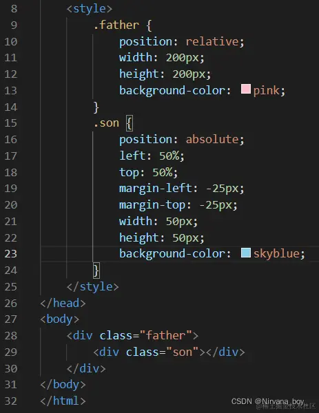 先为父盒子设置相对定位,再为子盒子设置绝对定位,且将子盒子分别向右、向下移动父盒子的一半,然后利用位移transform: translate;将子盒子分别向左、向上移动子盒子的一半。