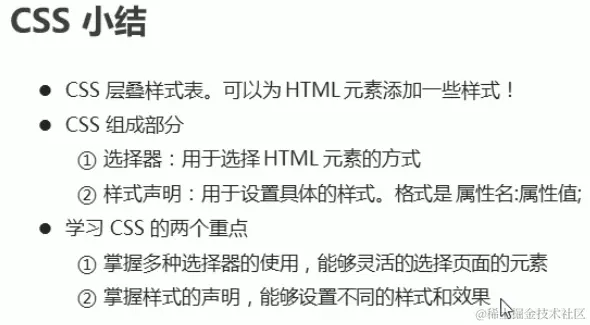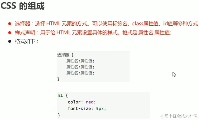 CSS主要由两个组成,分别是选择器和样式声明,选择器和样式声明,选择器其实就是选择HTML元素的方式,其可以使用标签名、class属性值、id值等多种方式,而样式声明则是声明不同的属性的样式,我们在上图中也可以看到一个CSS的选择器和样式声明的全过程,其实我们在HTML的时候已经用过这玩意了,这里就不再赘述了