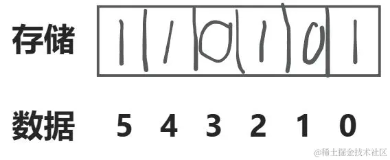 这里举例:我们将0,2,4,5放在数组中,这个数组就是110101,这里用图来帮助理解: