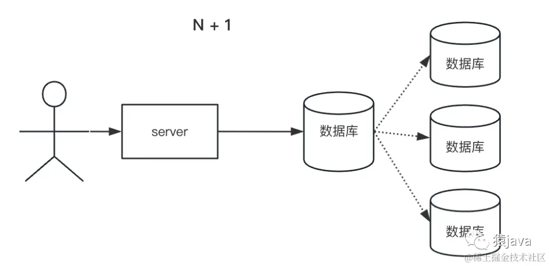 “N+1 问题” 是一个在数据库查询性能优化领域常见的概念,指的是在进行关联查询时,当你需要获取主表中的 N 条记录以及每条记录关联的另一个表中的相关信息时,会导致在获取相关信息时产生额外的查询操作,从而造成额外的负担和性能问题。如下图: