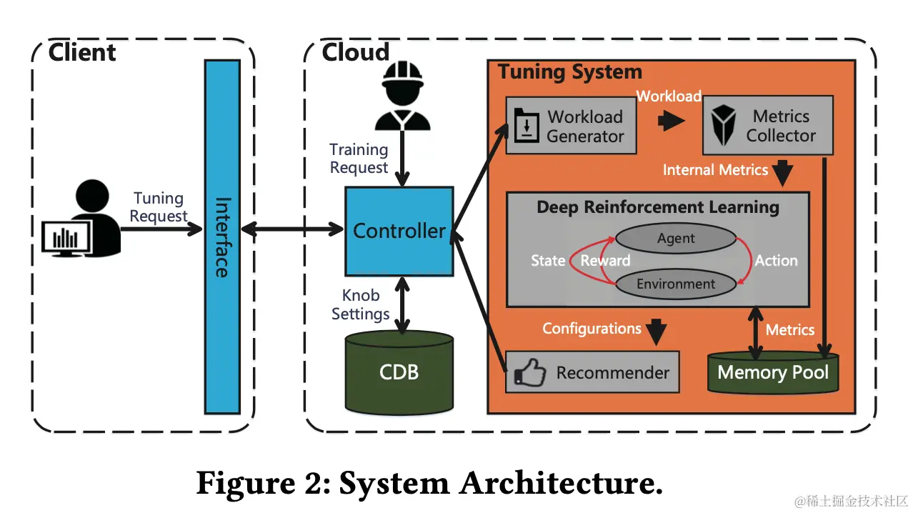 Agent:其实就是CDBTune,收到reward(性能的改变)和state,更新调参策略来获得更高的reward(更好的性能)。