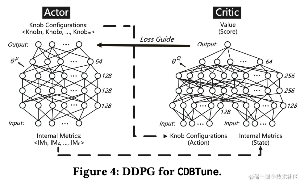 一个是和的差异,一个是和的差异。如果比好,说明调参的方向是对的,reward是正的。否则,reward是负的。reward的值也是针对这两个差异值进行计算。因此,DBA每次调参不只是考虑前一次的调参,还要考虑初始状态。令r代表reward,T代表吞吐,L代表延迟。和代表调参之前的吞吐和延迟。