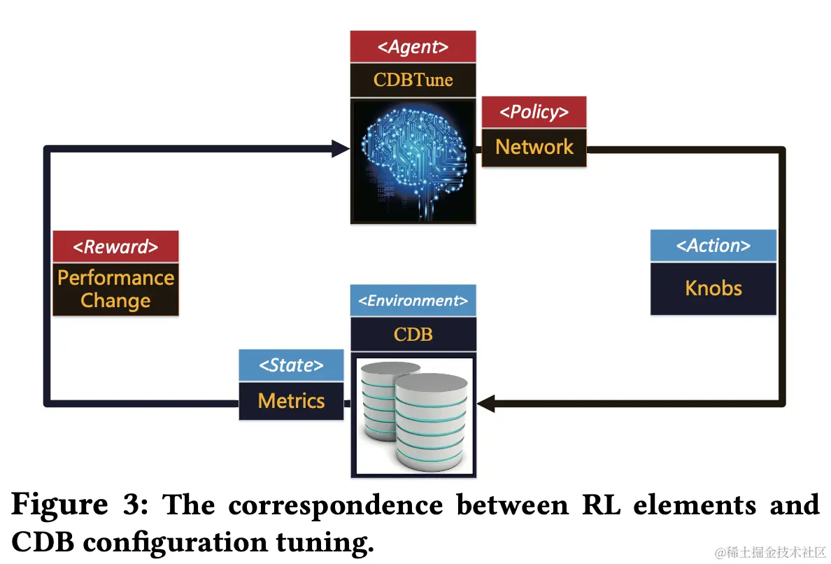 主要挑战是映射数据库调参场景到RL中的action。如图,描述了RL中六个关键元素和数据库调参的对应关系。