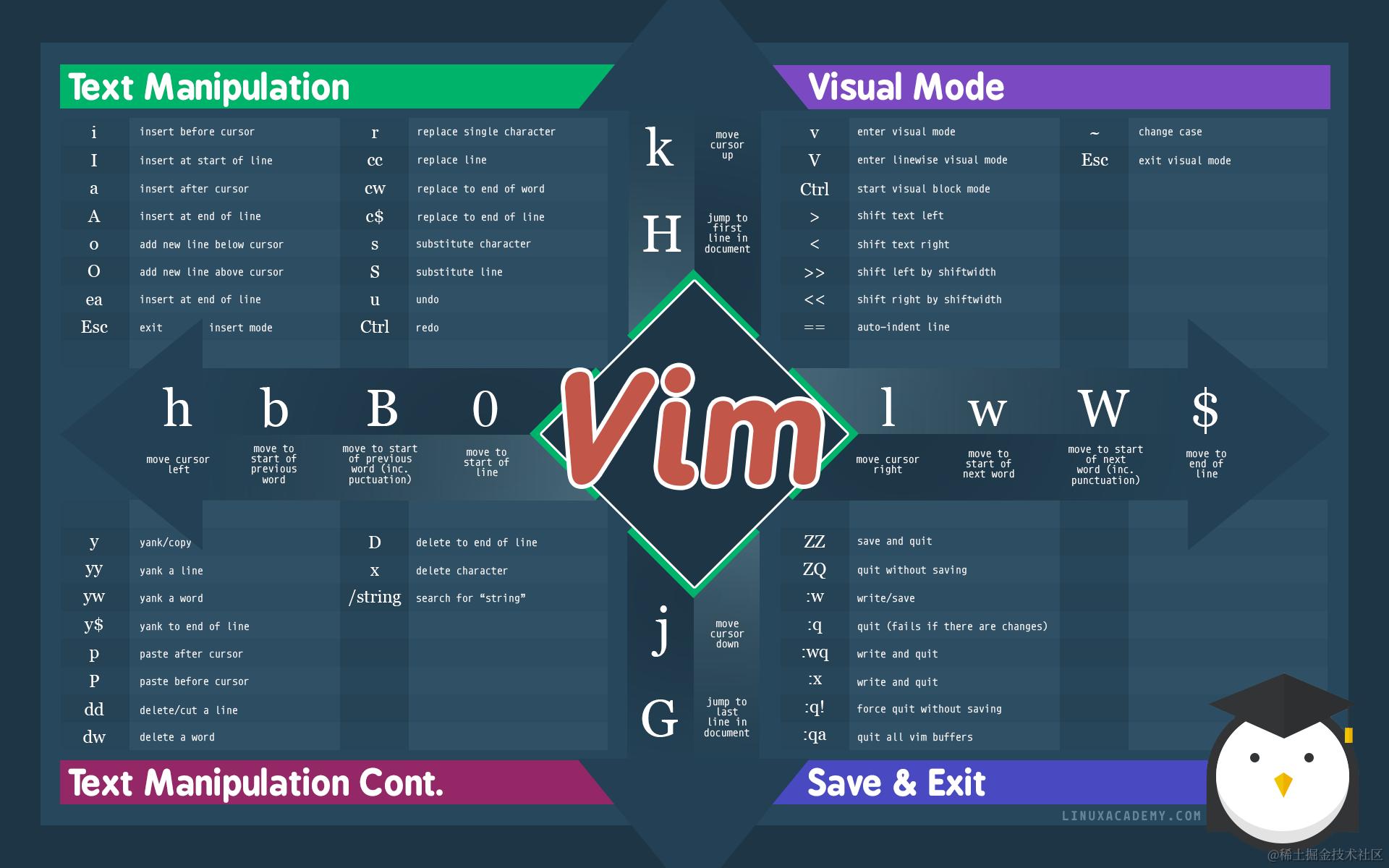 可以看后面的《使用 Vim》章节。先可以看看 文字版作弊纸,再贴两张作弊纸图: