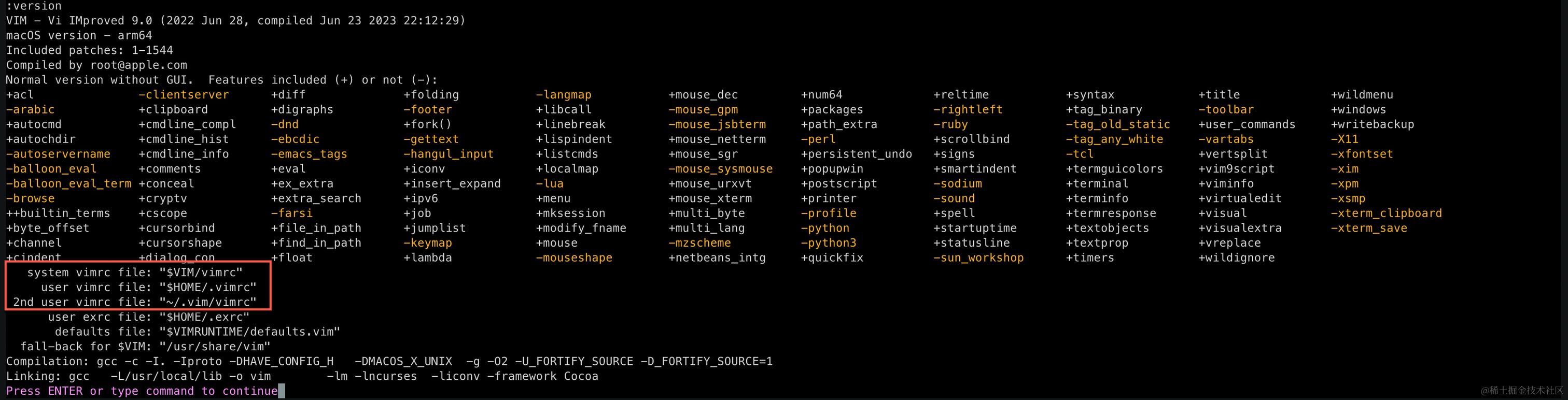 使用命令 :version 可以查看 Vim 的版本详情,里边有配置文件信息。