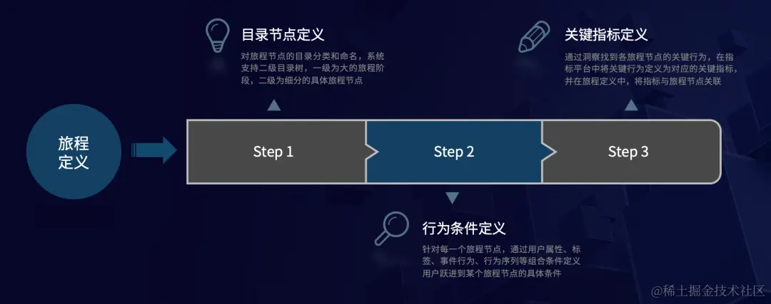 第三是关键指标定义,通过洞察找到各旅程节点的关键行为,在指标平台中将关键行为定义为对应的关键指标,并在旅程定义中,将指标与旅程节点关联。