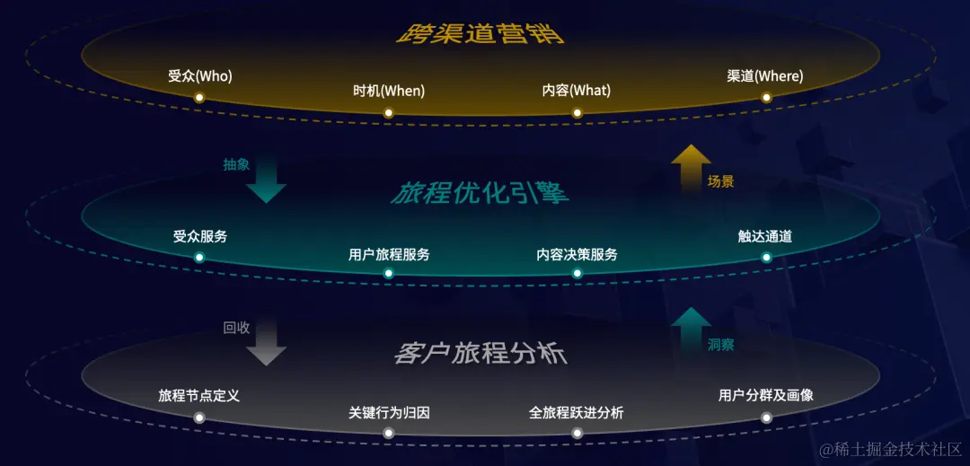 CJO 产品理念主要分为三层,底层是客户旅程分析,比如旅程节点定义、关键行为归因、全流程跃迁分析、客户分群及画像等。中间层是旅程优化引擎,包括受众服务、客户旅程服务、内容决策服务、触达通道等,我们不只提供工具,还有旅程编排服务和自动化工具。上层是跨渠道营销,根据实际运营情况,动态调整受众、时机、内容及通道等。
