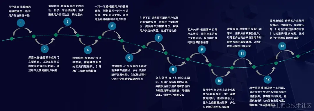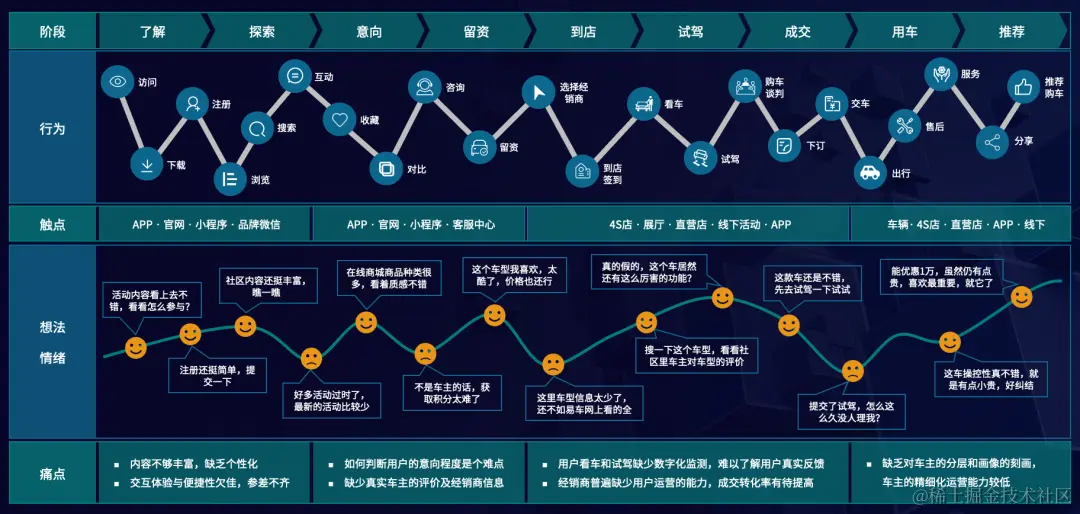 对车企来说,客户旅程可以分为了解、探索、意向、留资、到店、试驾、成交、用车、推荐等阶段。其中,每个阶段都有各自的关键行为和时刻,也都有不同的触点,车企需要弄清楚每个阶段的关键行为是在哪个触点、利用什么工具、涉及什么人群等。