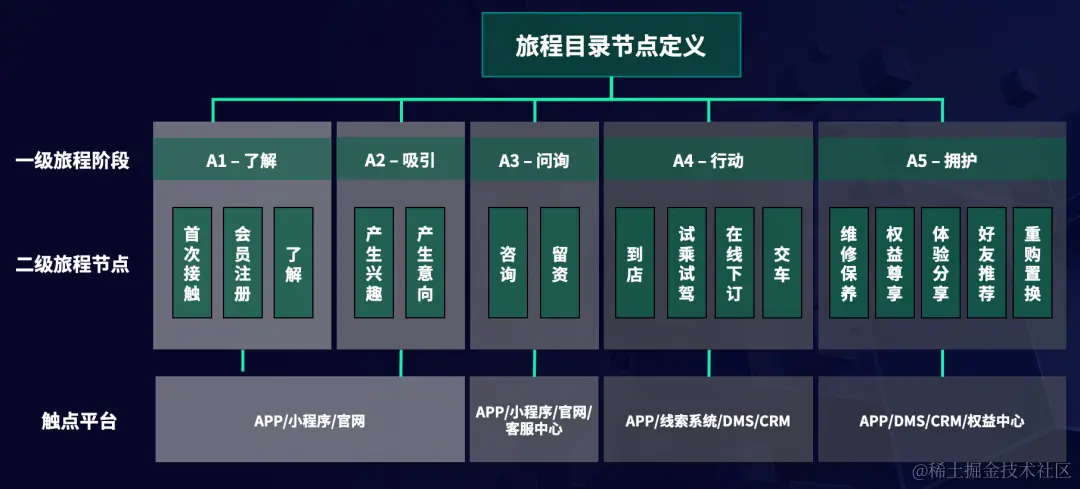 **• 阶段:**如何定义旅程阶段更合理?不同阶段之间的跃迁应该满足哪些条件,如何用数据量化?每个阶段该用什么样的行为进行判定?通过什么行为定义旅程升级还是降级?