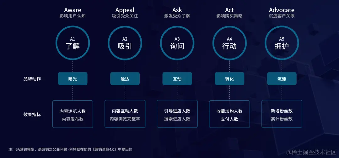 引入整合营销 5A 模型,即 Aware(了解)、Appeal(吸引)、Ask(询问)、 Act(行动) 、Advocate(拥护)。