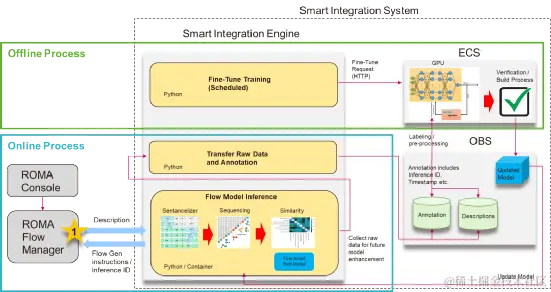 ROMA Connect 的智能集成的能力需要强大的AI智能集成引擎支撑。智能集成引擎是华为自研的AI 引擎,具有可扩展性和自学习性的特点。可扩展性是指,该引擎可以已插件化的方式支持以后更多的能力,比如智能数据映射,智能元数据发现。这些插件化的能力加载在下图的Online Process组件中,不会对整体架构产生影响。自学习性是指引擎会收集用户的反馈,通过脱敏后,用于对AI模型的再训练。这个再训练发生在下图的Offline Process组件中,通过Scheduling Fine-Tune Training 对模型训练,验证成功后在提交到Online Process 组件中上线使用。