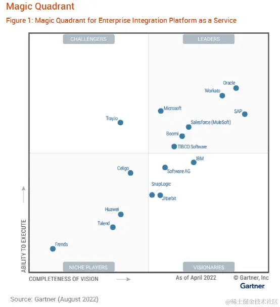 自从2022年底OpenAI发布第一版ChatGPT AI聊天机器人后,生成式AI在人工智能领域引起了新热潮。生成式AI 跟各种软件系统集成 ,根据需求输入自动生成相关文字,图片和影音,降低成本,提高了公司运作流程效率和从业者的工作效率。在企业集成EiPaaS领域,一些领先的厂商也在把AI运用到各种集成场景中。在2022年Gartner EiPaaS魔力象限里 17家企业中,有11家已经部署了AI智能集成服务,其中包括华为的ROMA Connect。华为是第一个连续两年进入Gartner EiPaaS魔力象限的亚洲公司。