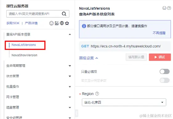 点击查询API版本信息 – NovaListVersions(查询API版本信息列表)
