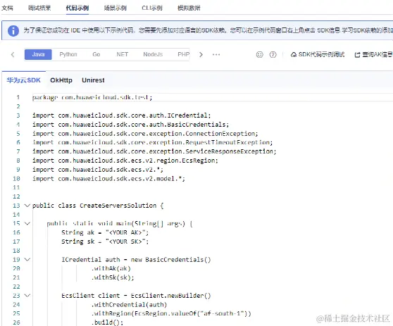 ●SDK中心华为云全新设计的SDK V3版本,提供统一的SDK使用方式。开发者可通过添加依赖或下载的方式调用华为云API,访问华为云应用、资源和数据。SDK为开发者提供详细的代码示例,便于开发者快速集成、快速开发。