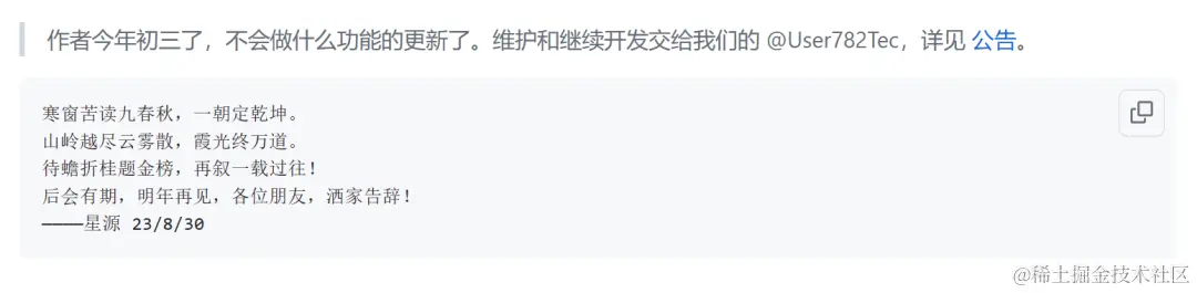 实际上在今年 5 月,也就是谭景元初二下学期时,他就已经发布过公告,宣布要暂别这个项目一段时间,以专心学习备战中考:“我...呃...立志要考七林,从今开始要好好学习了。所以我将有很长一段时间因太忙而无暇顾及项目,对此表示抱歉 (初三上可能还有时间,在过年之后就直接甩手了。”不过虽然短时间内不会再有什么功能更新,但谭景元还是将项目的维护工作进行了交接:“目前暂定将合作开发权限(push 权限)交给 @User782Tec 以在期间维护项目,在此提前表示非常感谢(如有意见欢迎提出)。”所以,期间开发者们体验过后如对该项目有任何意见或建议,可以在 GitHub 上提交 issues。