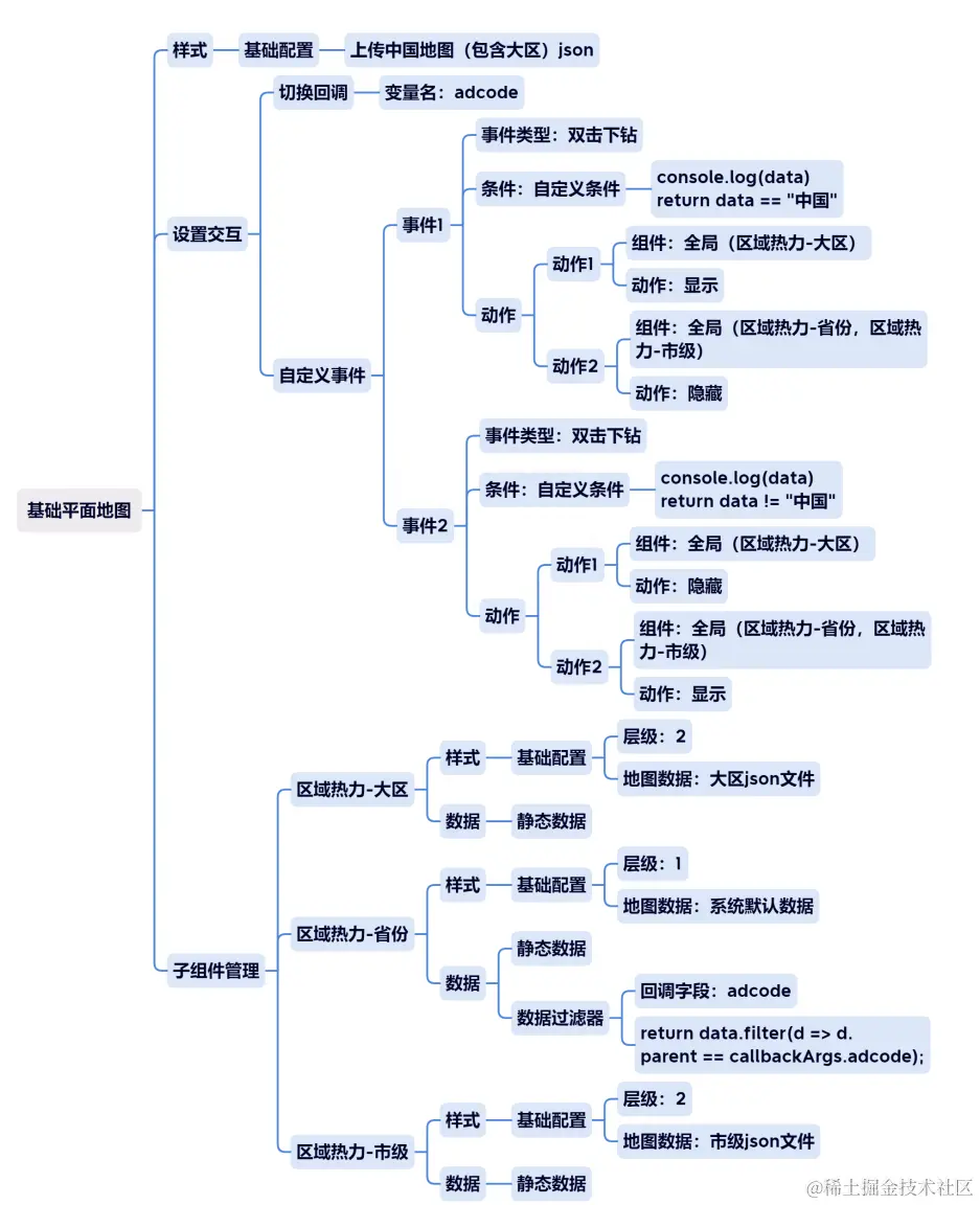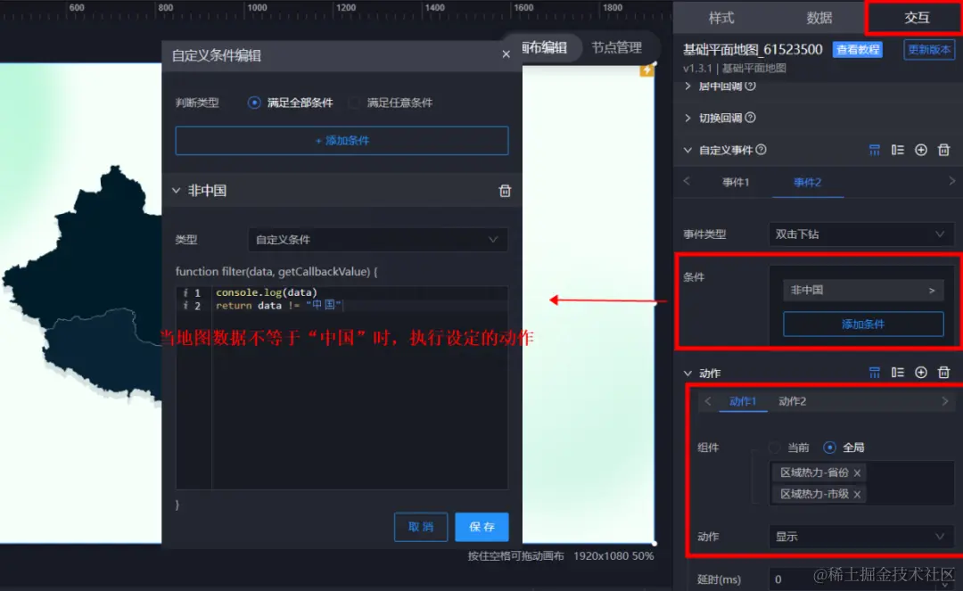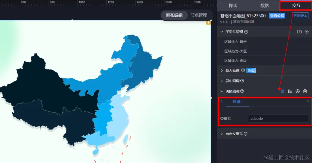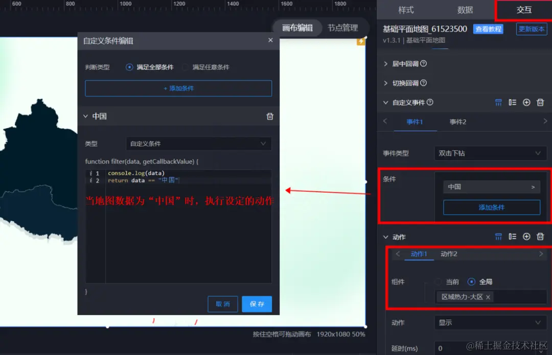 为了从大区下钻到省的时候,可以只出现下钻的某个省,周围的热力值隐去,因此需要配置交互来实现这一功能。