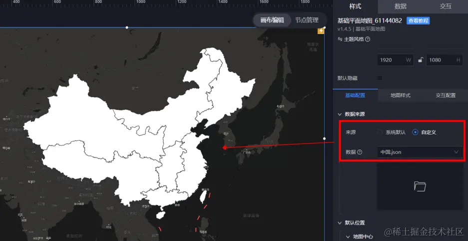 注意:因为基础平面地图中上传的json文件(即地图经纬度文件)是"中国.json",因此代码编辑如上,如果地图文件名称是自定义的,记得自己对应的修改哈~~