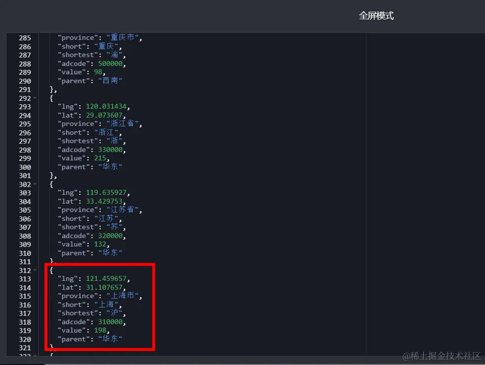 ❗ 注意:数据中必须包括“parent”,即该省份属于某一大区。例如上海属于华东,那么上海数组中的parent字段等于华东。