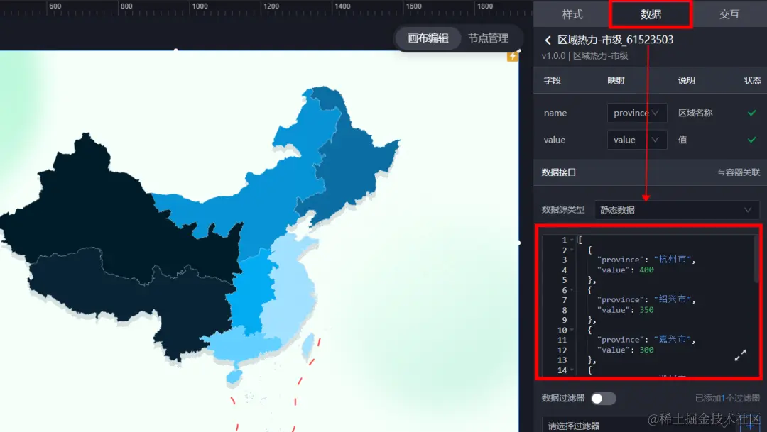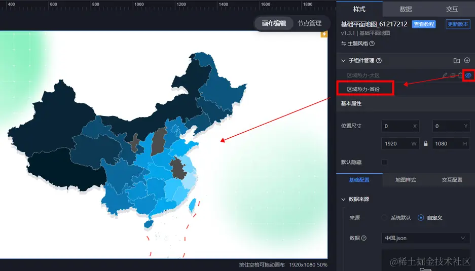 同上步骤,添加“区域热力-省份”,此时无需上传地图json文件,因为咱们EasyV特别贴心地内置好了~