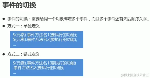 在某些情况下,我们可能需要给同一个对象绑定多个事件,而且这些事件还有先后的顺序关系,此时我们就需要给这些对象的事件进行一个切换