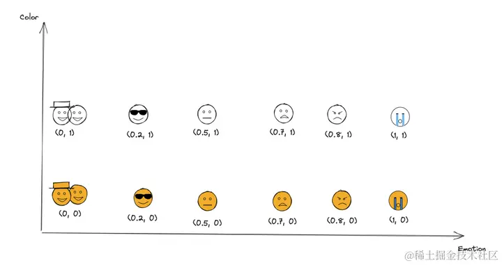 但是你会发现,如果只有一个维度来描述情绪 Emoji 的话,这是笼统的,也是不够准确的。例如开心,会有很多种类型的 Emoji 可以表达。那么这个时候我们通常是加入新的维度来更好地描述它。例如我们在这里加入 Y 轴,通过 0 表示黄色,1 表示白色。加入之后表达每个表情在坐标轴上的点变成了 (x, y) 的元组形式。
