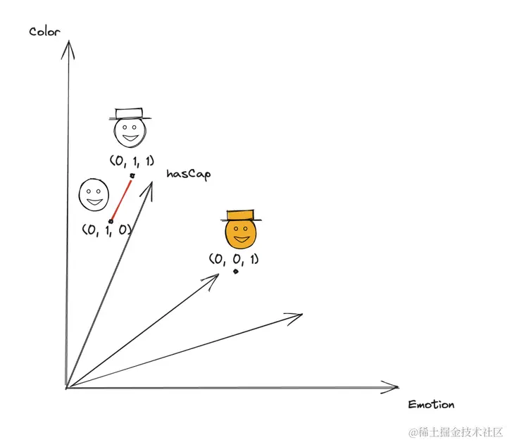 那么如果我们有一个之前从未出现过的一个 Emoji,我们通过上面的方式,可以把这个 Emoji 变成向量(0.01, 1, 0)。