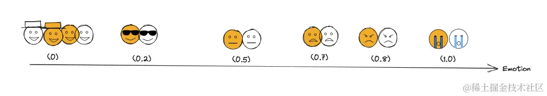 现在,假如开始用一个维度来表达 Emoji 表情的话,0 代表快乐,1 代表悲伤。从 0 - 1 的数字大小就可以表达对应表情的悲欢程度,如下 x 轴所示: