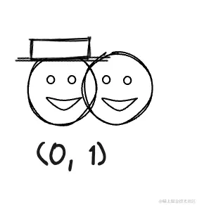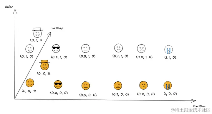 那么怎么办呢?解决这个办法依然很简单,再加一个维度。在坐标系中就是加入 z 轴。我们把新的维度简单设置为是否戴帽子(注意这里每个维度的取值尽可能地简单是为了阐述,不代表真实世界也如此简单)。用 0 表示没戴,1 表示戴了。所以我们现在就得到了一个 (x, y, z) 的三维坐标点来描述一个 Emoji 了。
