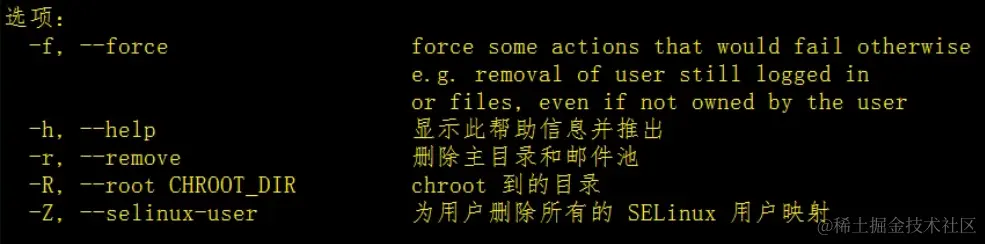 其中-r的意思是删除一个用户的同时还会将该用户对应的所有文件一起删除掉,而-f的意思是强制删除,不管这个用户是谁的,都要删除,那么我们就可以利用这两个方法来让我们的删除变得更加彻底,其语法是userdel -r -f 要删除的用户名