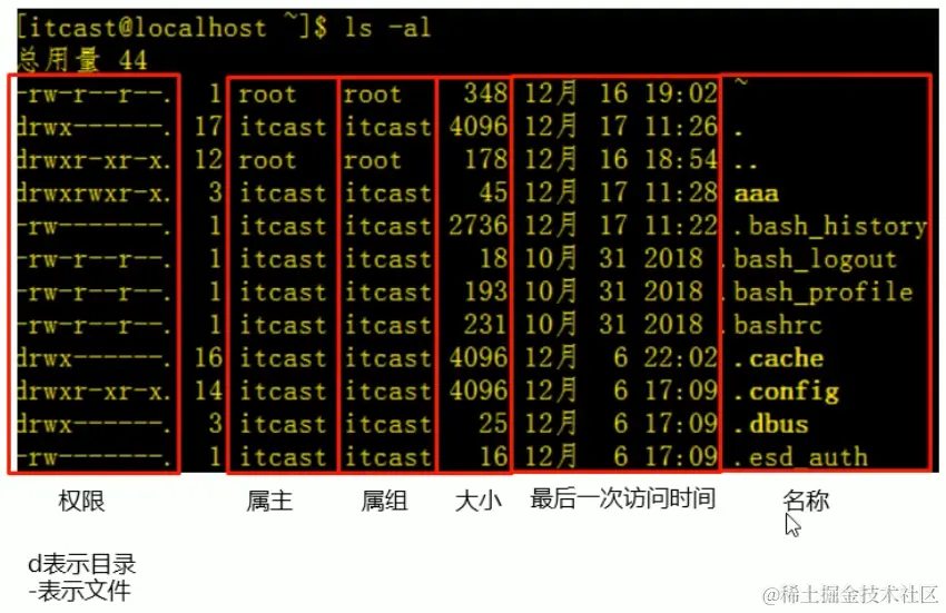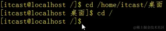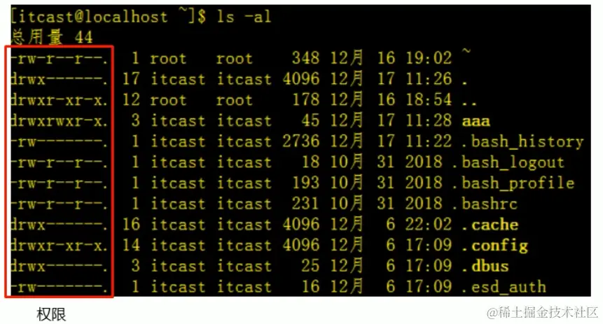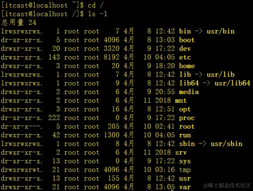 注意这里我们最开始的~代表当前的目录在默认的home目录下,我通过cd / 命令,将我们的目录进入到根目录/中,接着调用ls -l命令打印该目录下所有的文件并展示