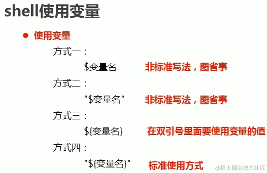 - 使用变量,使用变量有四种方式,第一种方式是变量名",第三种方式是{变量名}",第四种方式是最标准的使用方式。我们这里只需要记住第三种和第四种方式就可以了