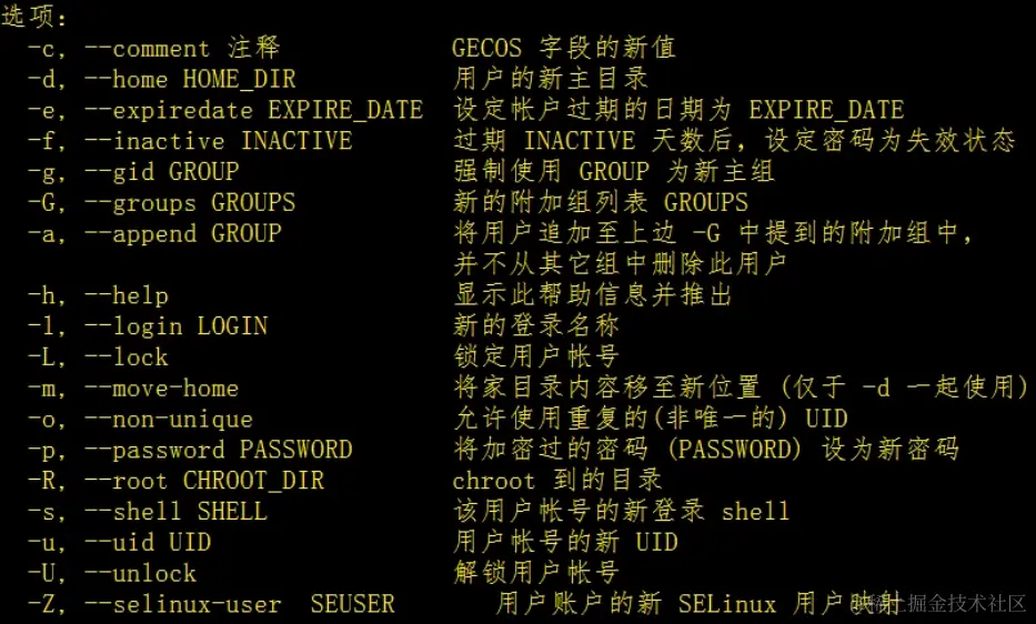 修改用户需要使用使用usermod语法,但是这里我们的选项是必须要选择的,那么这里有多少个选项呢?我们只要在对应的窗口下直接输入usermod,然后按下回车就可以查看到了