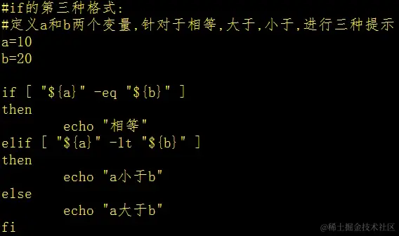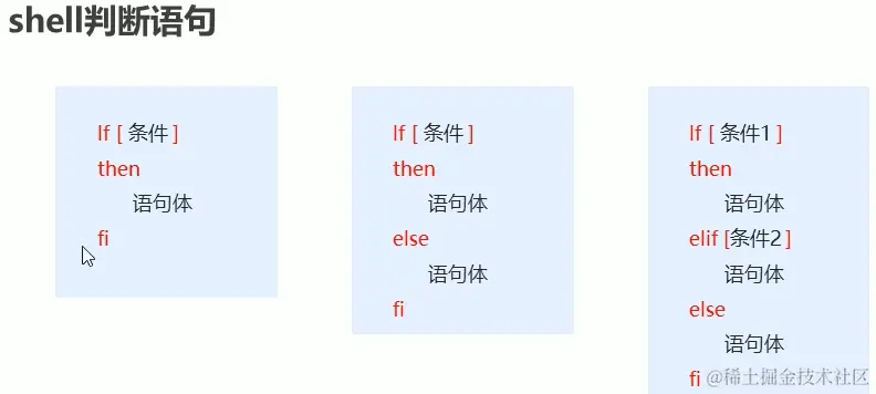 不同的是在Linux系统中,我们是用[]来放置判断条件的,而进入if条件后面要加上then,结束时要加上fi,而且代码块直接不需要大括号,最后是else if的语句被合并成了语句elif并加上判断条件