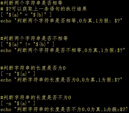 这里我们要提一下的是,$?可以获取上一个变量的结果,其次是在Linux系统中,1为假,0为真,不用true和false表示,而且居然还和我们一般想到的1为真和0为假反过来的,我真的吐了。还有就是注意到当我们使用判断字符串长度是否为0时我们要写入-z,这里我们-z写在前面而且是前后都带有空格的。接着我们继续写入如下命令