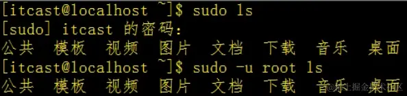 像上面第一个命令sudo ls,本来ls对于子用户而言是无法执行的,因为没有足够的权限,但是这里先用了sudo之后就可以执行了,这是因为sudo命令先提高了子用户的权限,不过需要输入密码(如果有密码的话)。而后一句的代表的意思是是直接指定root来执行ls命令