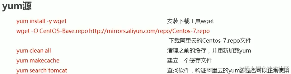 为了实现这个目标,我们首先要下载wget,因此我们先输入yum -y install wget,接下来我们要对原来的yum源进行一个备份,因此我们要先进入其对应的文件夹(这个文件夹就是/etc/yum.repos.d/),因此我们输入cd /etc/yum.repos.d/,这样就可以进入到yum源的对应文件夹了。那么接下来我们要对该配置文件做一个改名,我们输入mv CentOS-Base.repo CentOS-Base.repo.back,这里我们输入mv之后输入文件原来的名字+文件要设置的名字,按下回车就完成了一个改名动作了,那么到此为止,我们的备份动作就完成了。接下来我们就要更改yum源了,我们输入wget -O CentOS-Base.repo mirrors.aliyun.com/repo/Centos…,这样就把我们的yum源更改为阿里云的yum源了,如果我们输入cat CentOS-Base.repo,能够看到很多的aliyun关键词,说明我们已经成功将我们的yum源更改为阿里云的yum源了。但是这样还没完,我们还要清理下我们之前的缓存并重新加载下这个新的yun源,因此我们要再输入yum clean all,这样我们之前的缓存文件就清理完毕了。接下来我们还要给我们的yum源新建一个缓存文件,我们再输入yum makecache,等待其完毕之后就新建完毕了。如果我们想要验证的话,我们可以验证下我们之前看过的tomcat文件,我们输入yum search tomcat,在界面中会显示对应的信息,可以看到里面已经变成了aliyun的关键字了,这就说明我们已经成功了