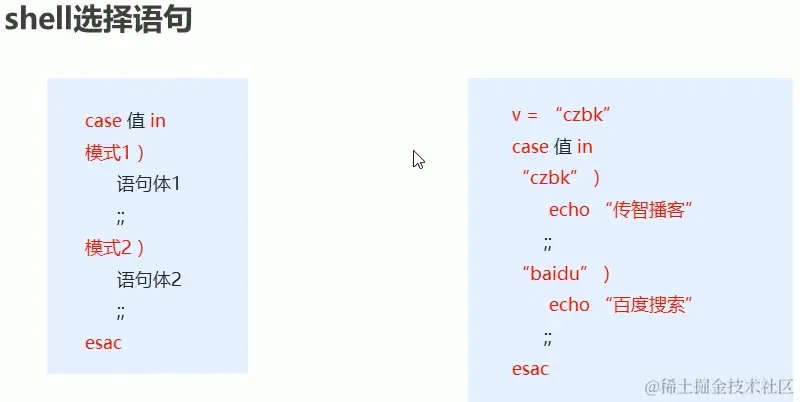 不过这里仍然值得一提的是这里我们只要先定义一个变量,里面存储值,然后其会每次将变量的值取出来与我们在括号内定义的值进行对比,如果相等则会执行下面的语句。而;;就相当于是java中的break,最后esac则是结束语句