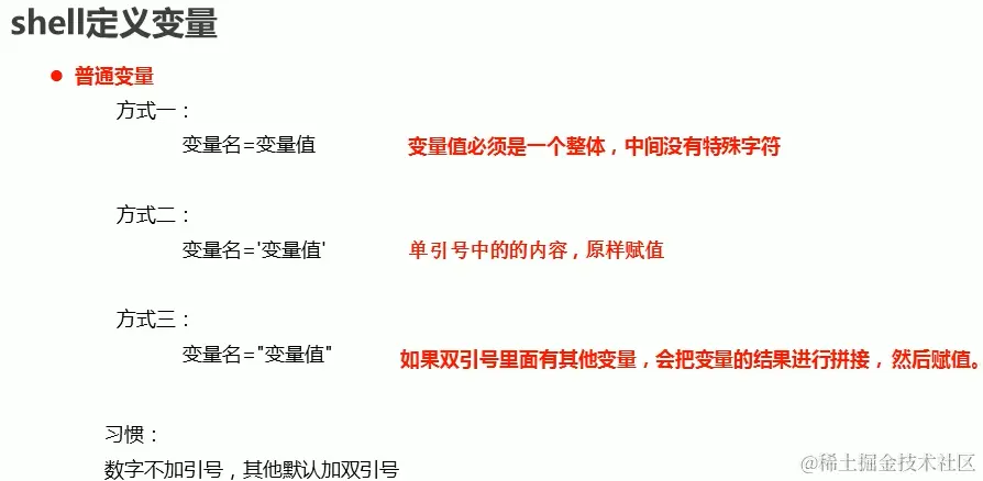 - 定义变量,定义变量有三种方式,第一种方式是变量名=变量值,但这种方式要求变量值必须是一个整体,中间不能有特殊字符(如空格),第二种方式是变量名='变量值',这种方式会将单引号中的内容原封不动的赋值给变量,第三种方式是变量名="变量值",这种方式的特点是如果双引号中有其他变量,其会先获得变量的结果与原来的内容进行拼接,然后赋值给变量。一般来说,如果我们的变量是数字,我们选择第一种方式,如果不是,则选择第三种方式