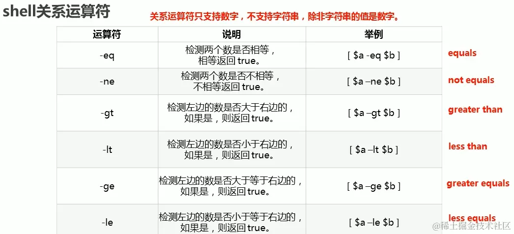 - shell关系运算符,注意这个关系运算符只能用于判断数字,不能用于判断字符串,除非字符串的值是一个数字