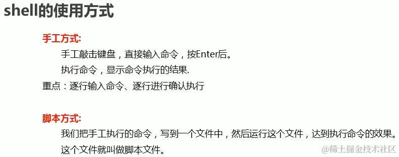 那么现在还有最后一个问题,就是我们的shell要怎么使用呢?一般而言,有两种方式,一种是手工方式,一种是脚本方式,所谓手工方式就是直接手打输入,而脚本方式是先将一系列需要执行的命令写入到一个文件中,然后执行这个文件,达到执行命令的效果,这个文件就叫做脚本文件