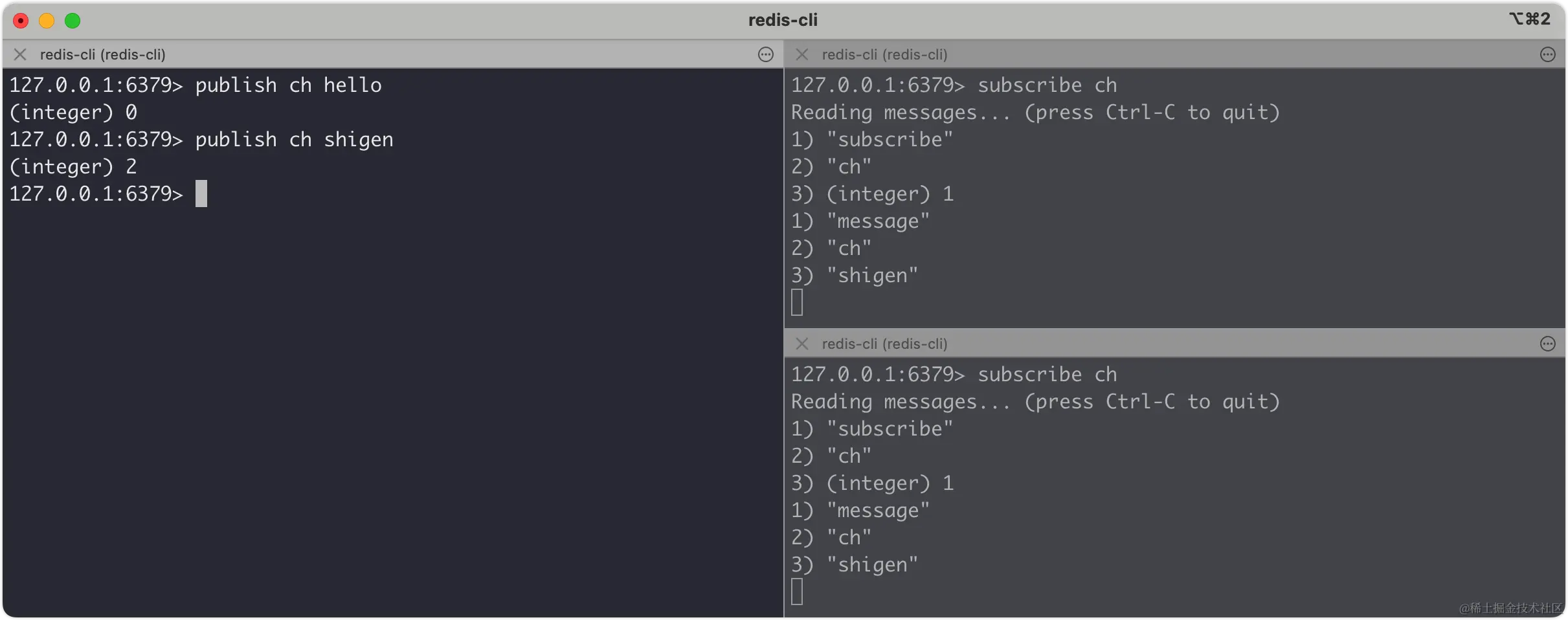 | PUBLISH channel message | 将消息 message 发送到指定的频道 channel |