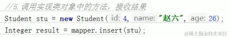 这里我们完成的插入操作,因此我们这里内部写入的代码是INSERT_INTO以及INTO_VALUES,而且我们新增sql语句需要传入一个学生对象,因此这里的接受参数需要一个学生对象。然后我们将我们的注释代码修改如下